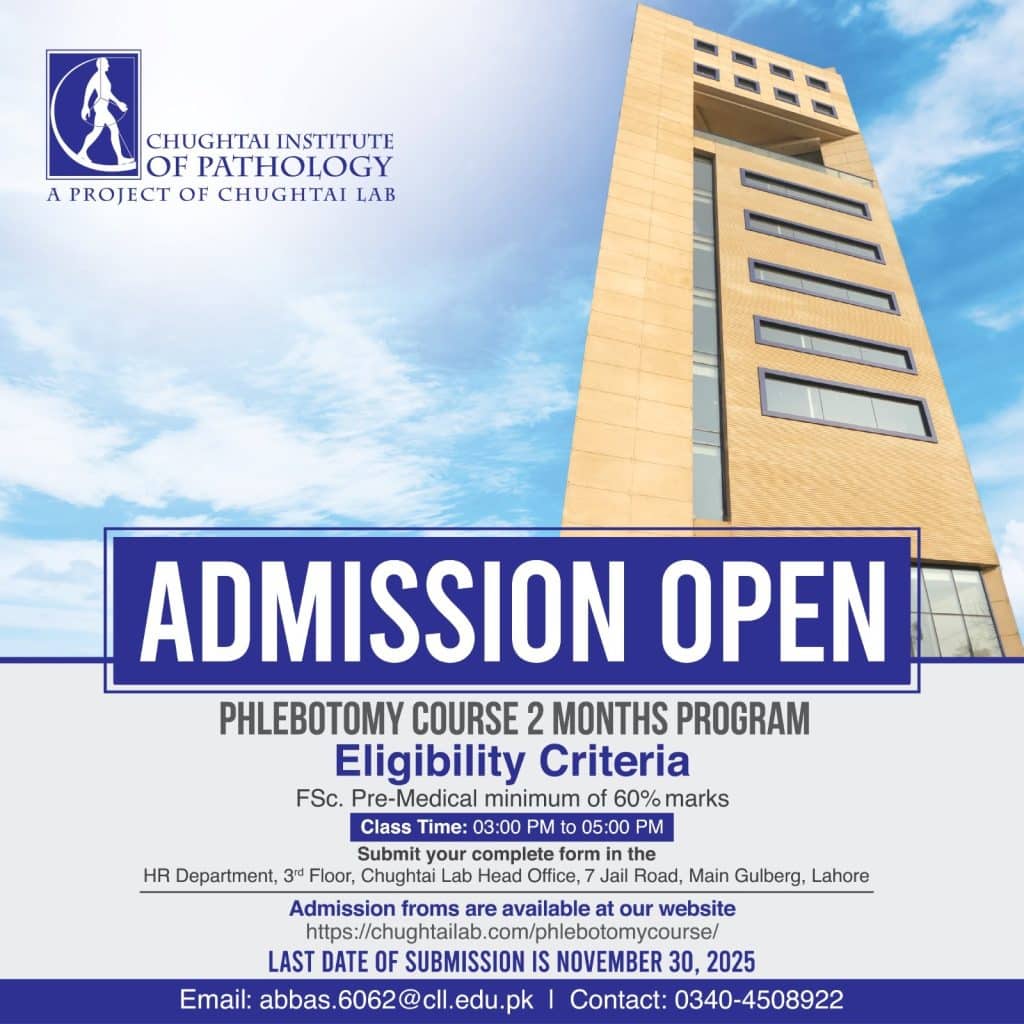 Chughtai Institute of Pathology invites applications for its comprehensive Phlebotomy Certification Program designed to develop essential technical skills and professional competency in a clinical setting.